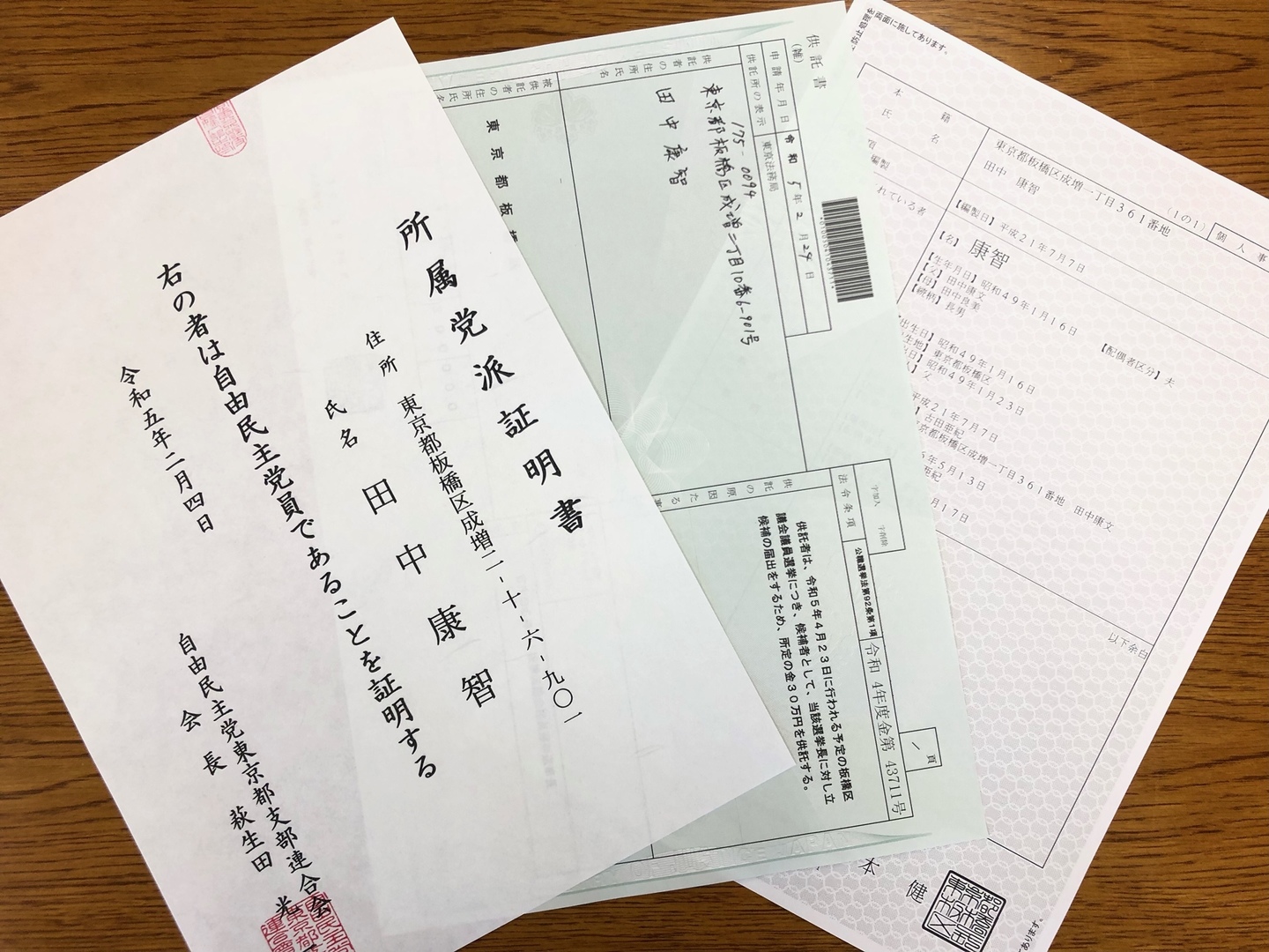 必要な書類には、会派所属証明書、30万円供託したことを証明するもの、戸籍や申請書類一式です。集めるのにも一苦労。