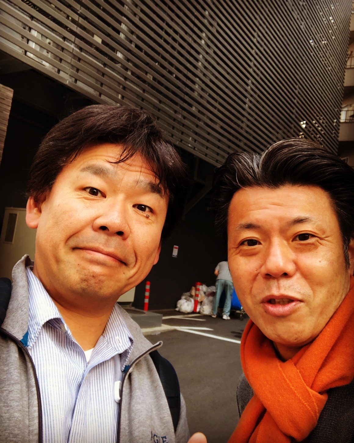 肉離れで松葉杖の状態で通勤で通りかかった友人と記念撮影をしたので画像アップします。