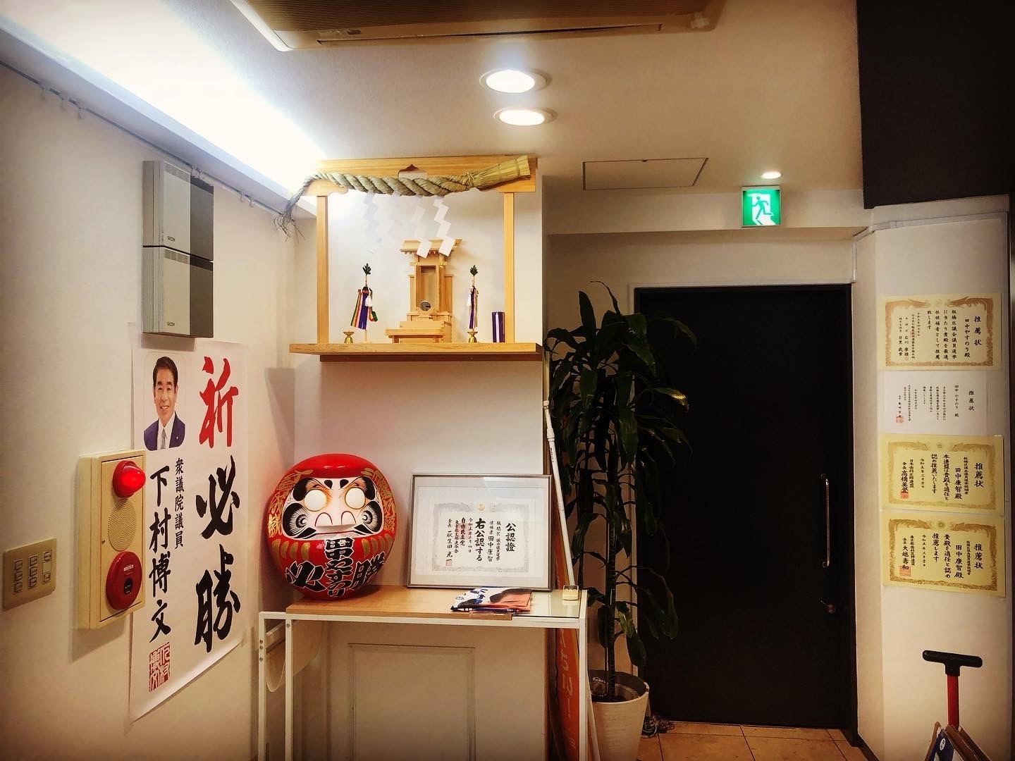 昨晩には、日付が変わる少し前の時間まで、選挙事務所用の看板の設置と選挙戦までは見えないようにする目隠し対応をしてもらい、今日は神棚の取り付け工事、為書き貼りなど室内のしつらえと整えてもらいました。