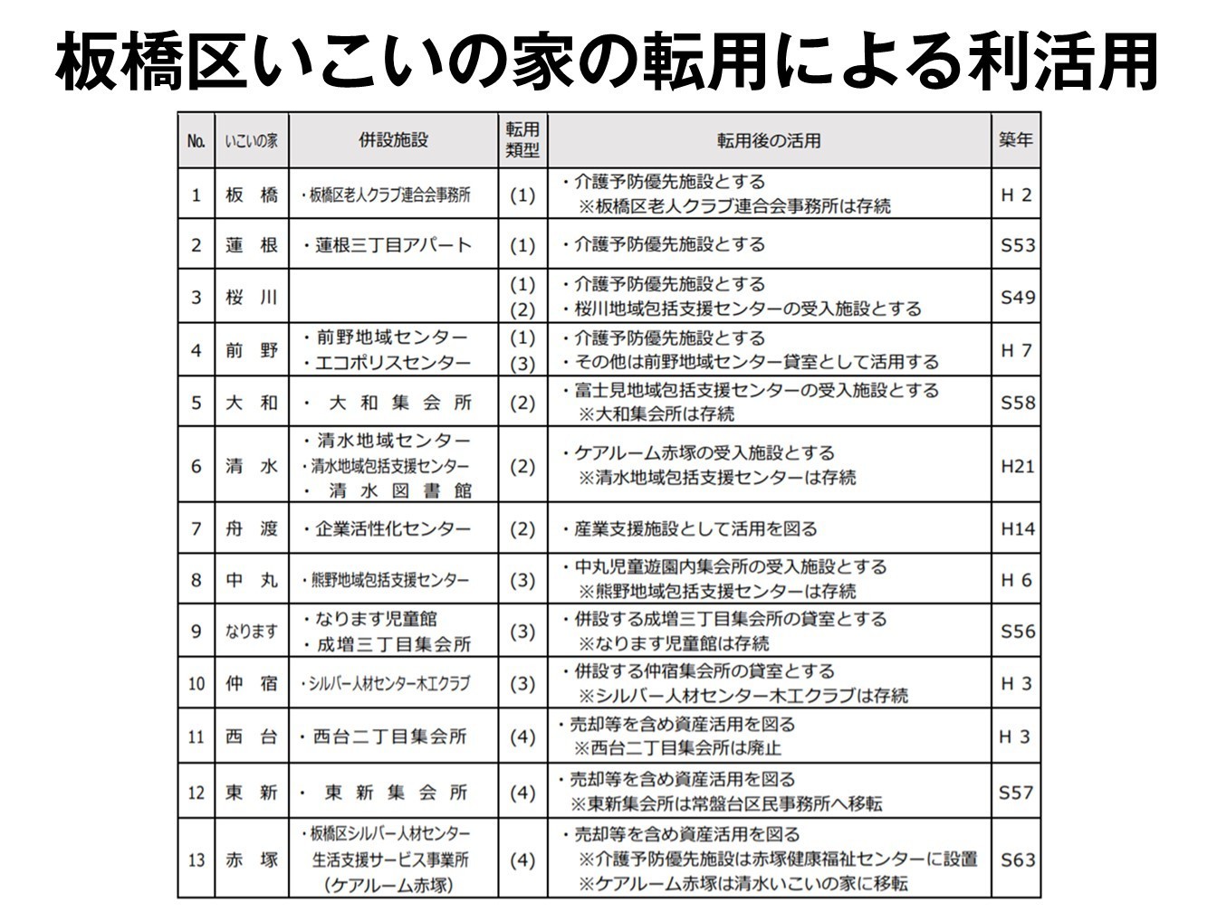 現在あるいこいの家13施設は、下記にしるしたように(1)「介護予防施策の拠点へ転用」、(2)「他の施設への転用」、(3)「集会施設への転用」、(4)「廃止して売却などの資産活用」に4つに大きく用途が分かれます。