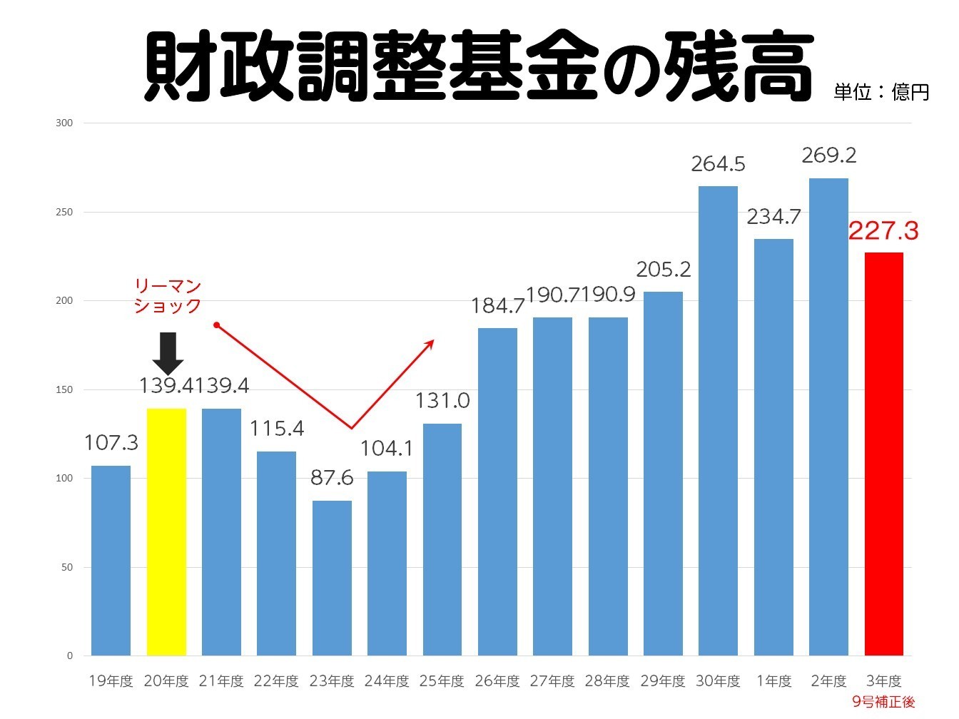 今回の補正予算では約2,281万円の財政調整基金を取り崩し、その財源としました。補正予算後の財政調整基金の残高は「約227億3,400万円」となります。