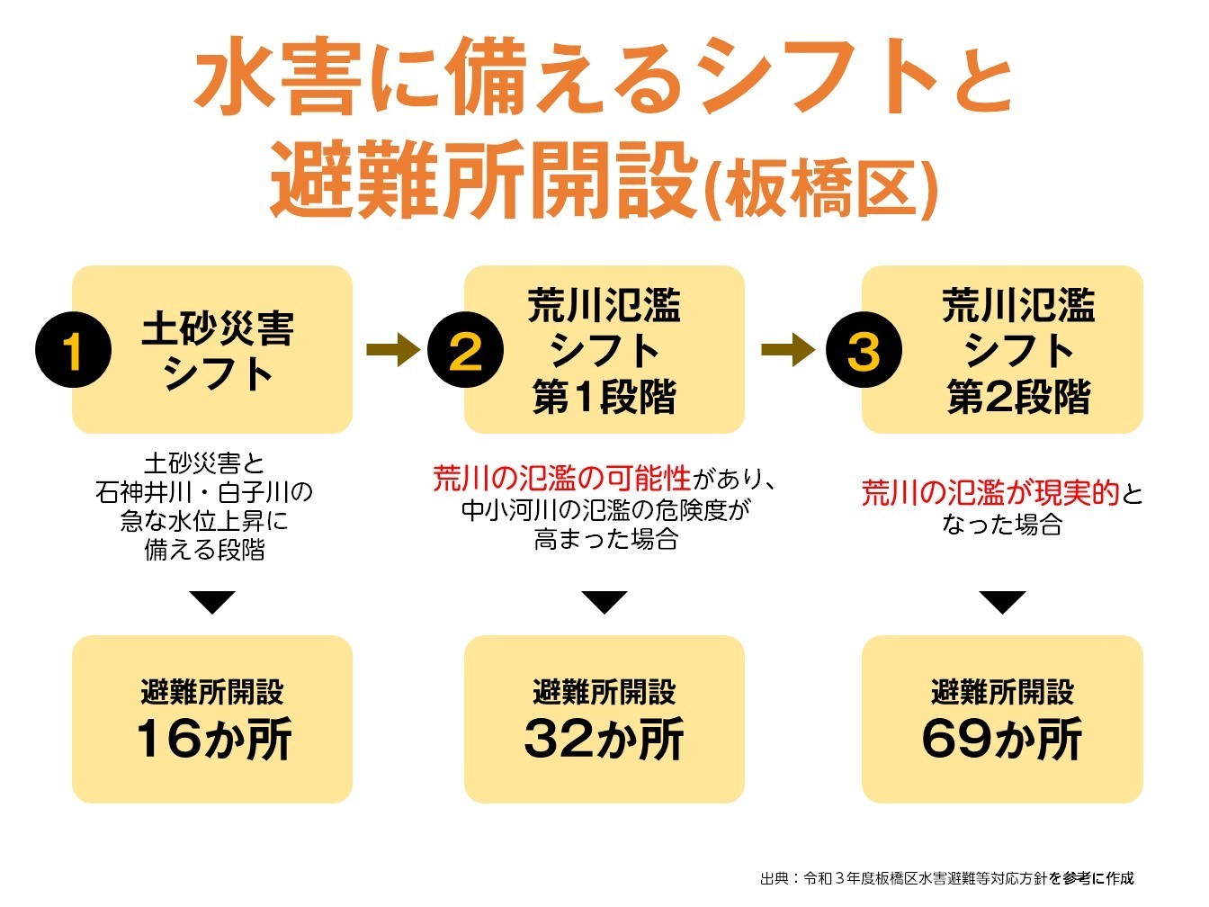 そして、このシフトの段階が進むにつれて、開設される避難所が増えていきます。土砂災害シフトでは 16か所→荒川シフト(第 1段階)では 32か所→荒川シフト(第 2段階)では 69か所の避難所が開設されます。