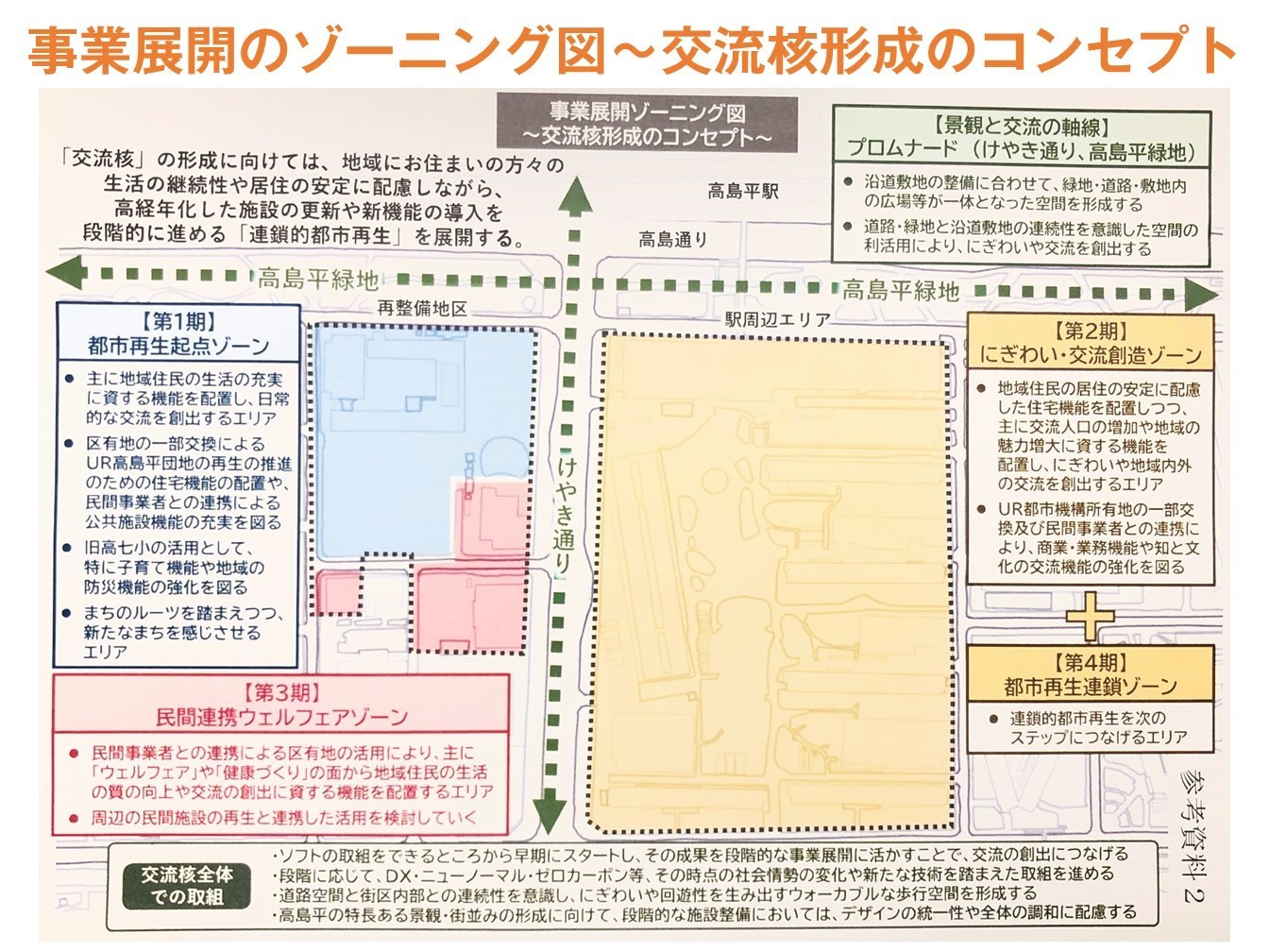 「事業展開のゾーニング図」と「交流核のゾーニング図」が委員会に報告事項として示されましたので、お伝えをしたいと思います。