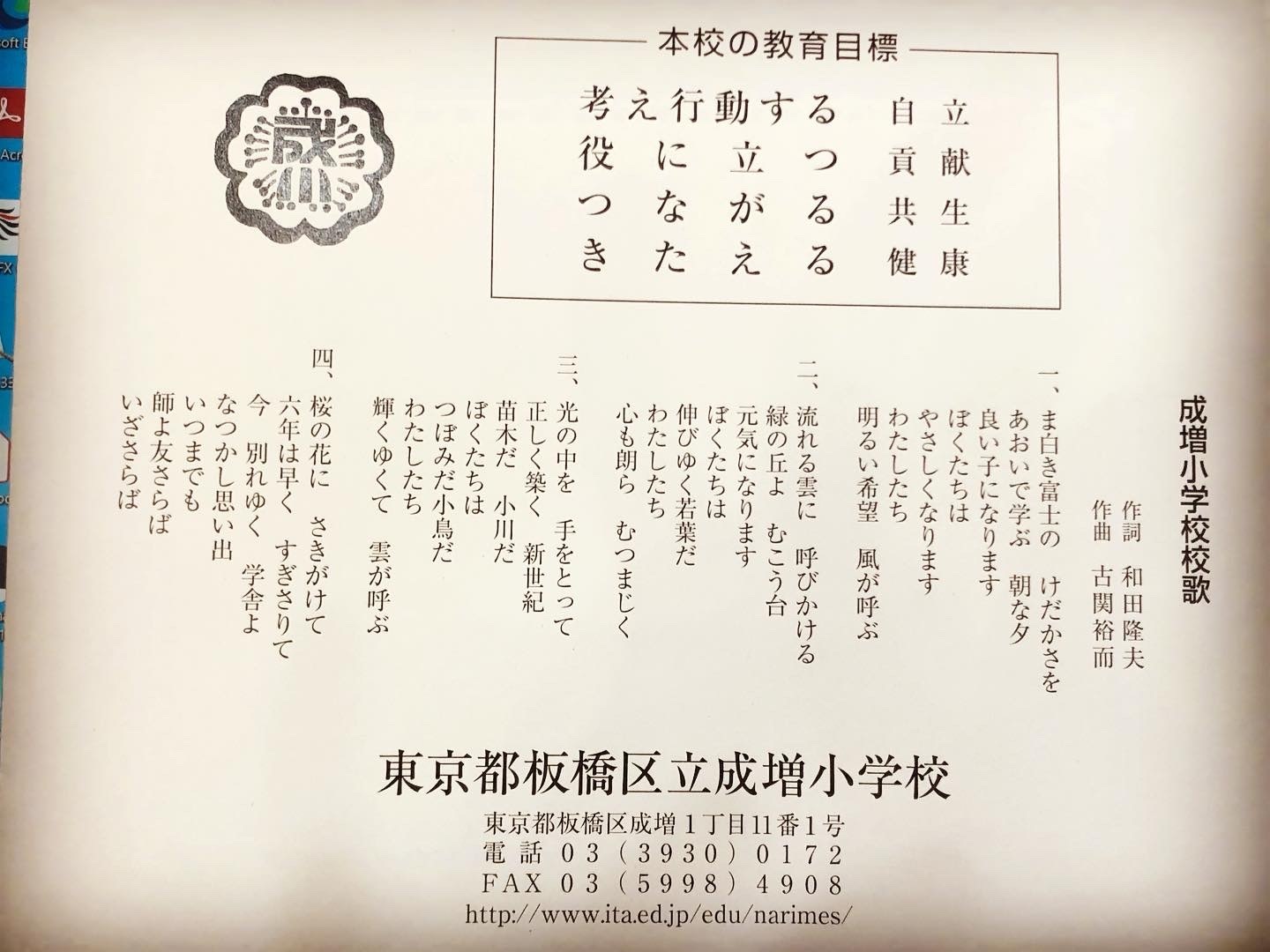 自分の小学校6年生の時と比べると、みんな随分としっかりしているとビックリ。明るい未来を確信しました。「ま白き富士の けだかさを~」。小学校の校歌はいくつになっても覚えているものですね。校歌の画像をアップしました。成増小出身の方はとても懐かしいのではないでしょうか。よく見てみると、「4番」があります。卒業式の時だけに歌われるものだそうです。数年前の周年行事の際に、過去の資料を調べていた時に偶然発見したそうで、それ以来卒業式で歌われております。