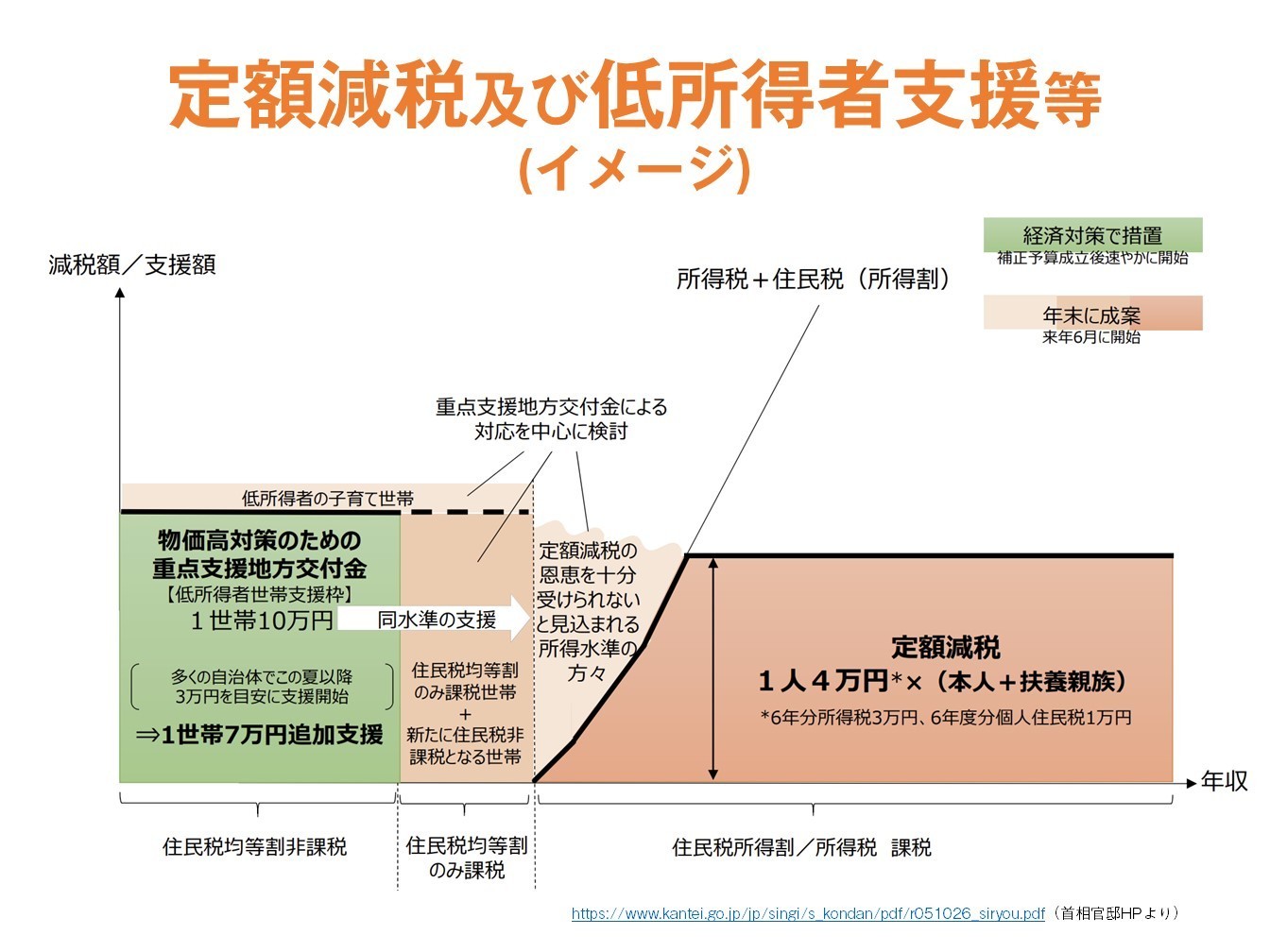 国では今回の定額減税とともに、令和6年度から新たに住民税の非課税世帯と均等割のみ課税世帯に対して、1世帯あたり10万円の給付金を支給します。国の支援策の全体イメージは下記の図を参照ください。