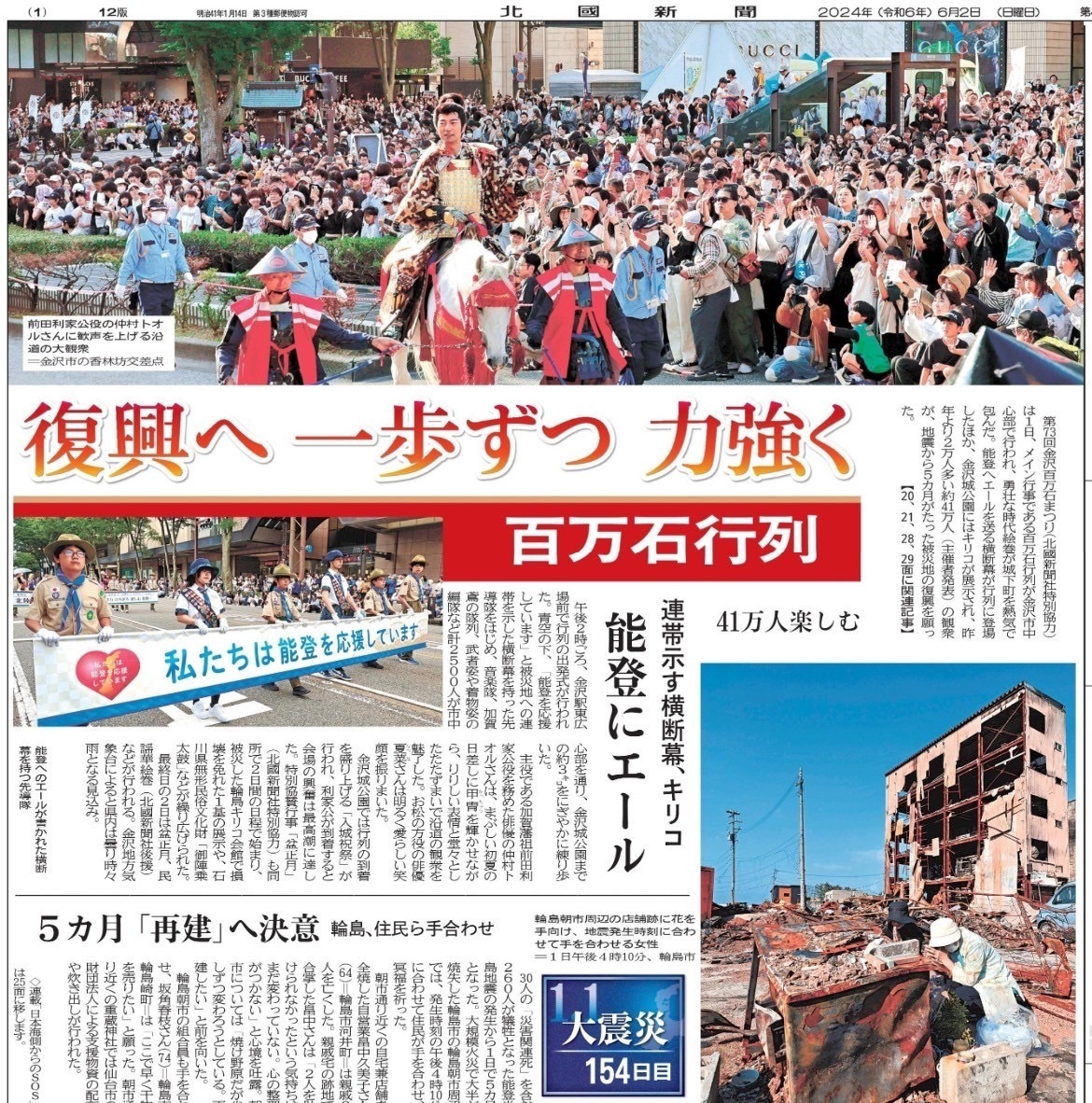 また、メイン行事である百万石行列の藩主行列には区職員が参加し、その姿もしっかりとみて参りました。長い距離、お疲れさまでした。
