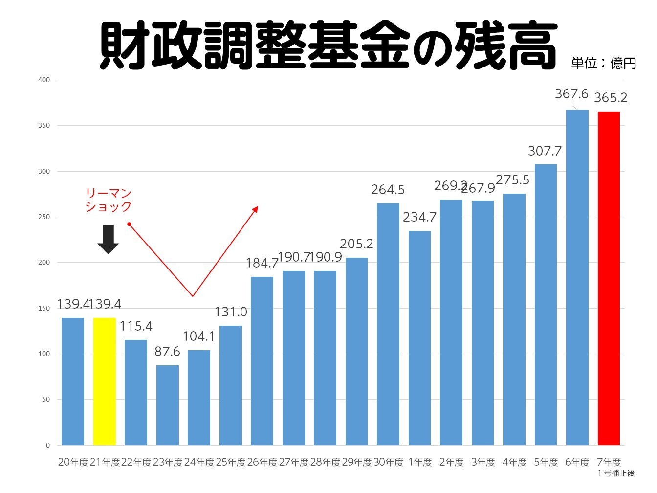 最後に、補正予算(第1号)後の財政調整基金の残高は365億2,837万円となります。
