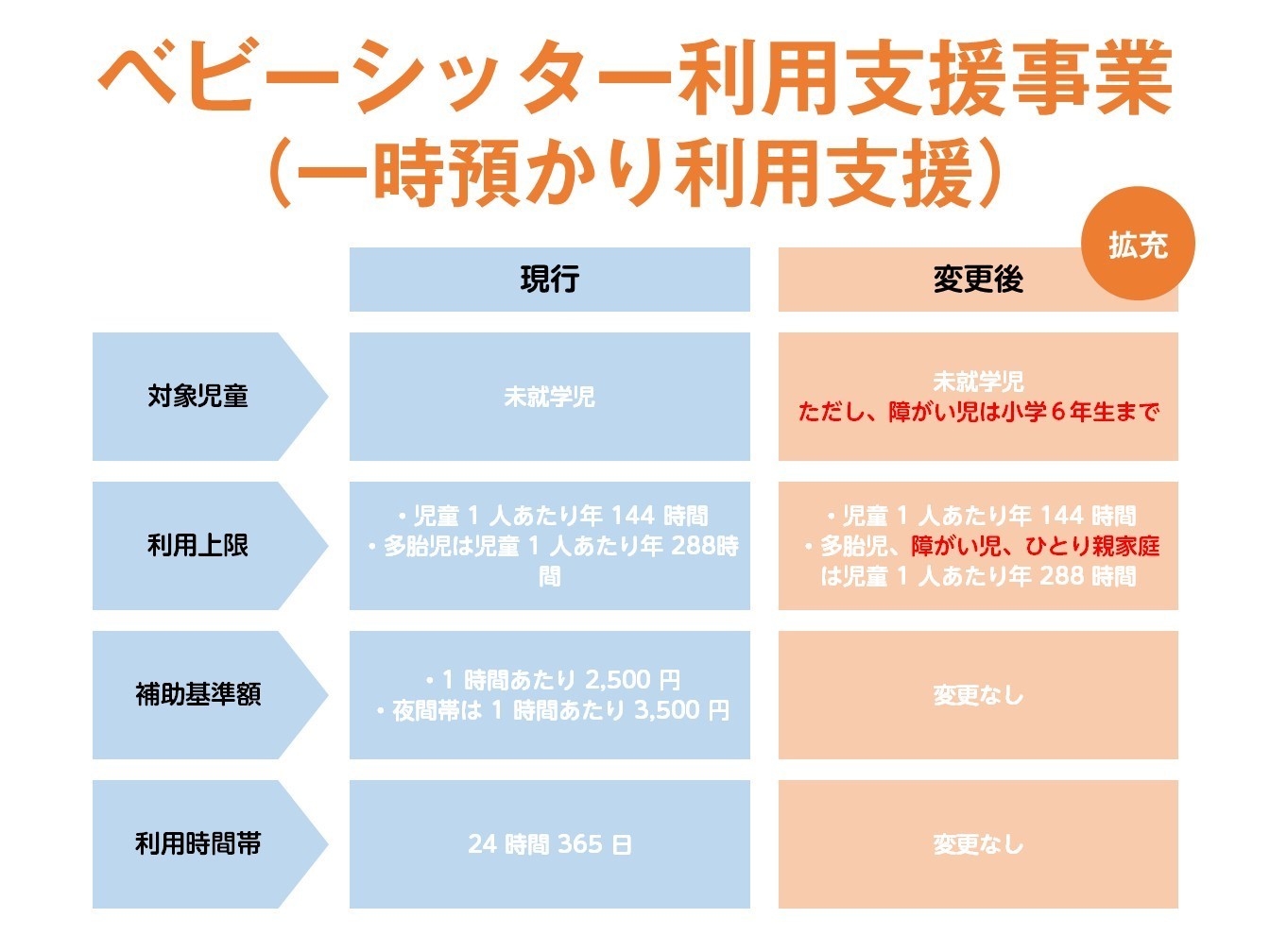 (現行) 児童 1 人あたり年 144 時間。多胎児は児童 1 人あたり年 288時間→(新) 児童 1 人あたり年 144 時間。多胎児、障がい児、ひとり親家庭は児童 1 人あたり年 288 時間。
