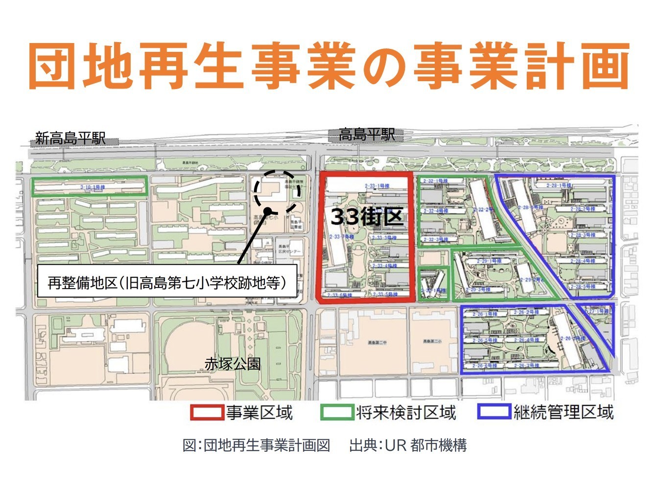 URと板橋区は2024年に協定を結び、土地の一部交換などを通じて団地再生を連鎖的に進める計画を確認しました。つまり、まず小学校跡地などに高層マンションを新設し、そこへ既存住民が移転。空いた33街区を次の新設予定地として活用する。こうしたサイクルを繰り返しながら、団地全体を段階的にリニューアルしていくという計画です。