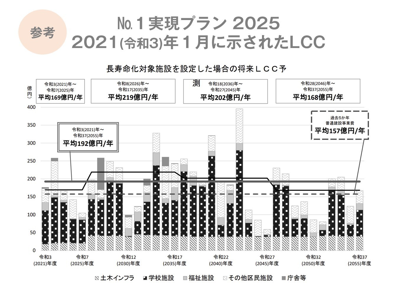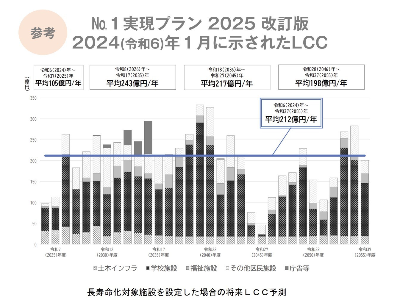 現在、事業環境の変化や労務単価の更新などを織り込みまして、ライフサイクルコストの精査を行っているところでございます。11月の閉会中の企画総務委員会で、No.1プランの素案の報告時に明らかにする予定で今進めているところでございますが、現時点での大まかな見通しでございますけれども、ご紹介いただきましたNo.1プラン2025改訂版でお示しした212億円、年平均からおよそ50億円ほど上ぶれるんではないかという見込みでございます。