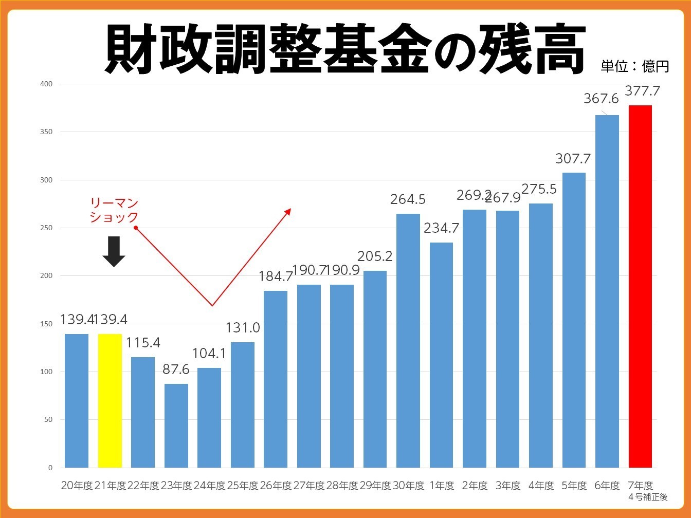 そのため約46億円の財政調整基金を取り崩すこととなりました。補正予算成立後の財政調整基金残高は377億7,355万円となります。